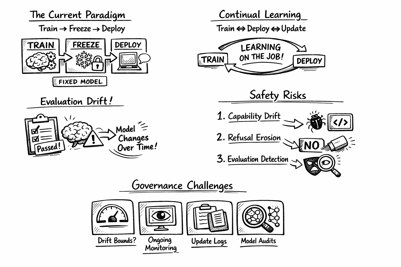 Continual learning removes the fixed point. The model that passed your evaluations at deployment is not the model users encounter a month later. This isn’t a minor technical detail—it invalidates our primary tools for ensuring AI systems behave as intended.